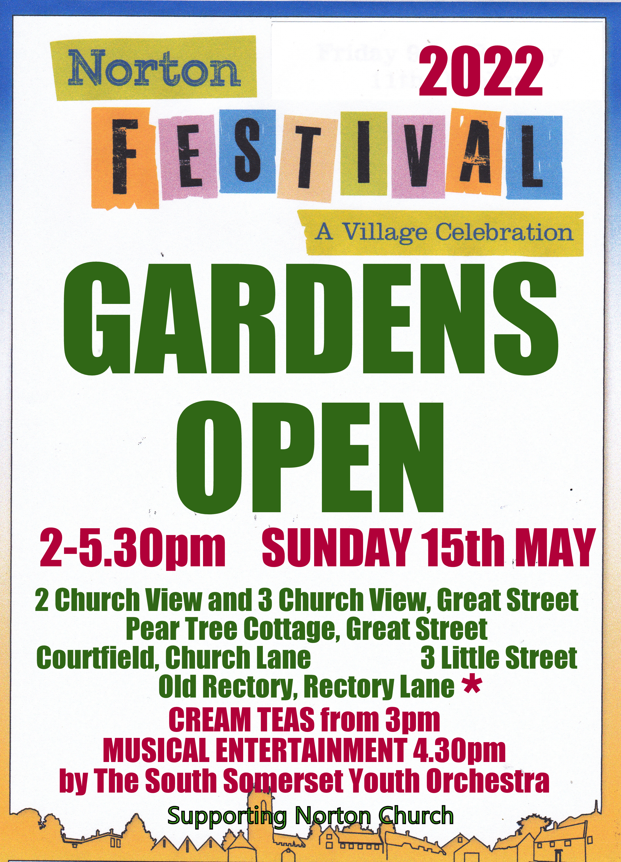 The Norton Festival of Gardens Open 2022 takes place on the third Sundays of May, June and July from 2pm until 5.30pm. Up to six gardens will be open on each Sunday and one of the gardens will be serving Cream Teas from 3pm and have Musical Entertainment at 4.30pm. The Event supports Norton Church and details of each garden can be found in a publicity leaflet available locally.